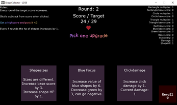 This one is for the Highscore chasers! Click the shapes and get points. After the round ends, take an upgrade. Get more points. Don't click the skulls and reach your target score for the next round.