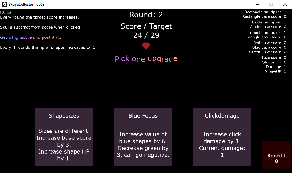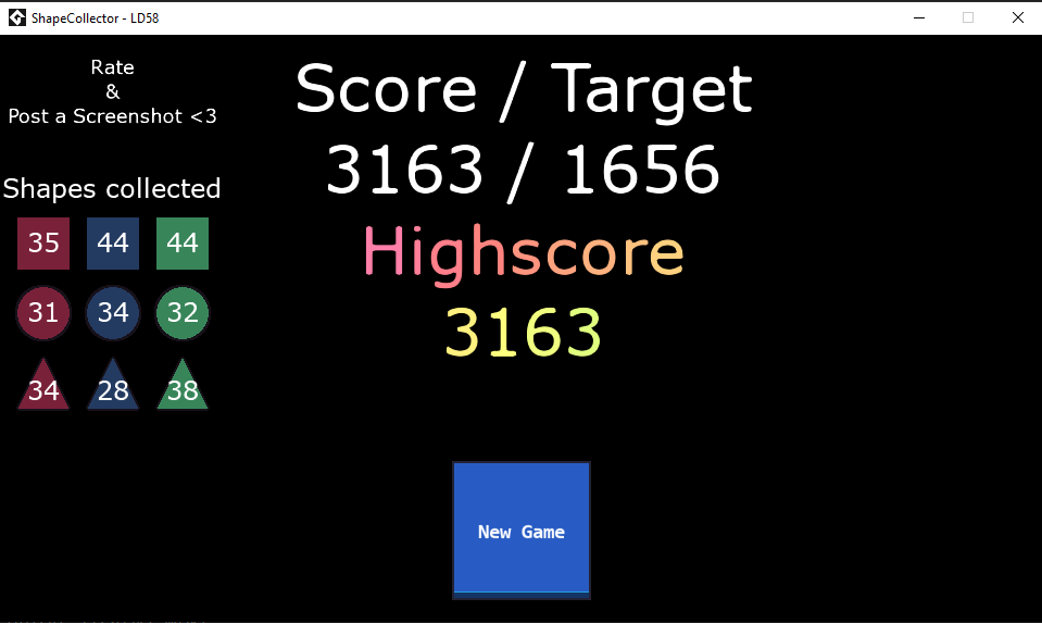 I’d love to hear your feedback! Feel free to leave a comment and rate the game. Post a Screenshot of your highscore!! https://ldjam.com/events/ludum-dare/58/shape-collector
